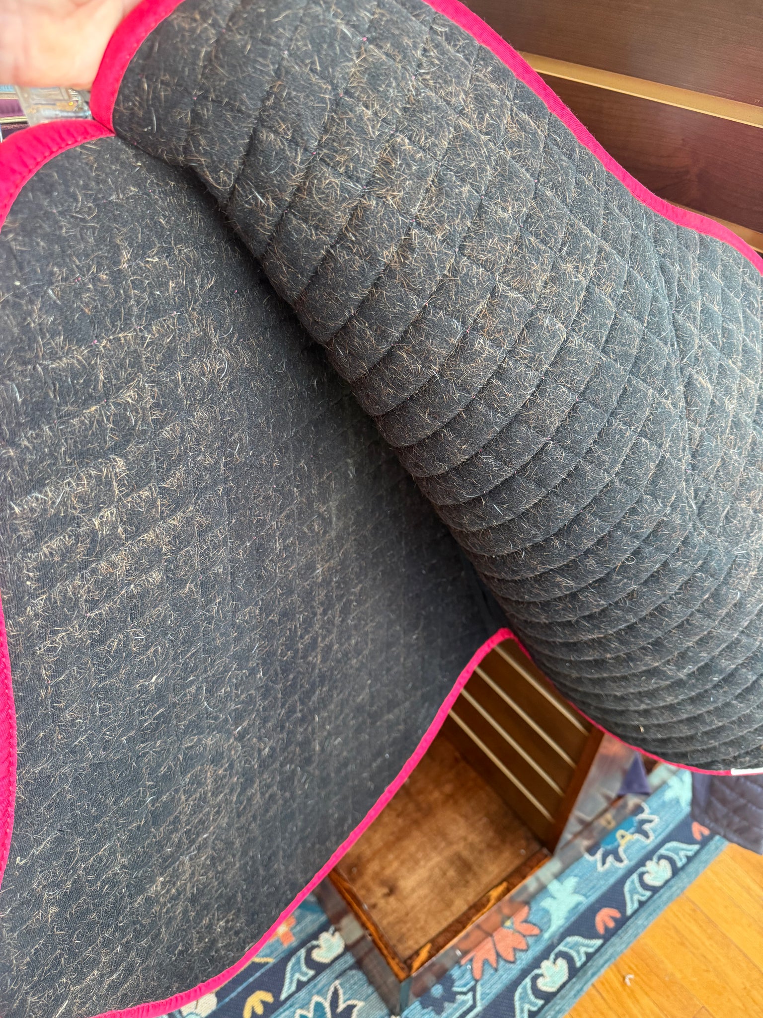In excellent condition! Top side very clean with no stains. Underside is clean, but had lots of hair stuck to it. Normal amount of wear.