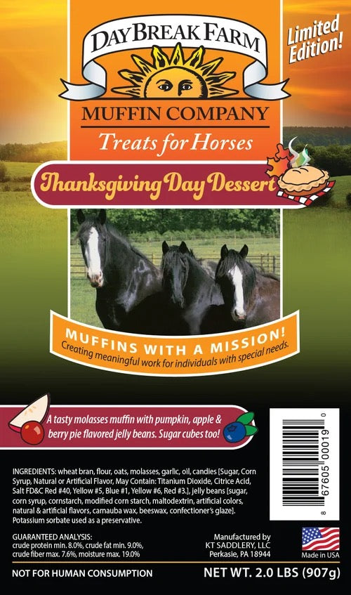 DayBreak Farm horse treats are delicious molasses muffins topped with candies and sugar cubes with the exception of our Special Edition muffins. Each Classic & Seasonal muffin have a sweet treat center based on the variety of the muffin. (Random selection)